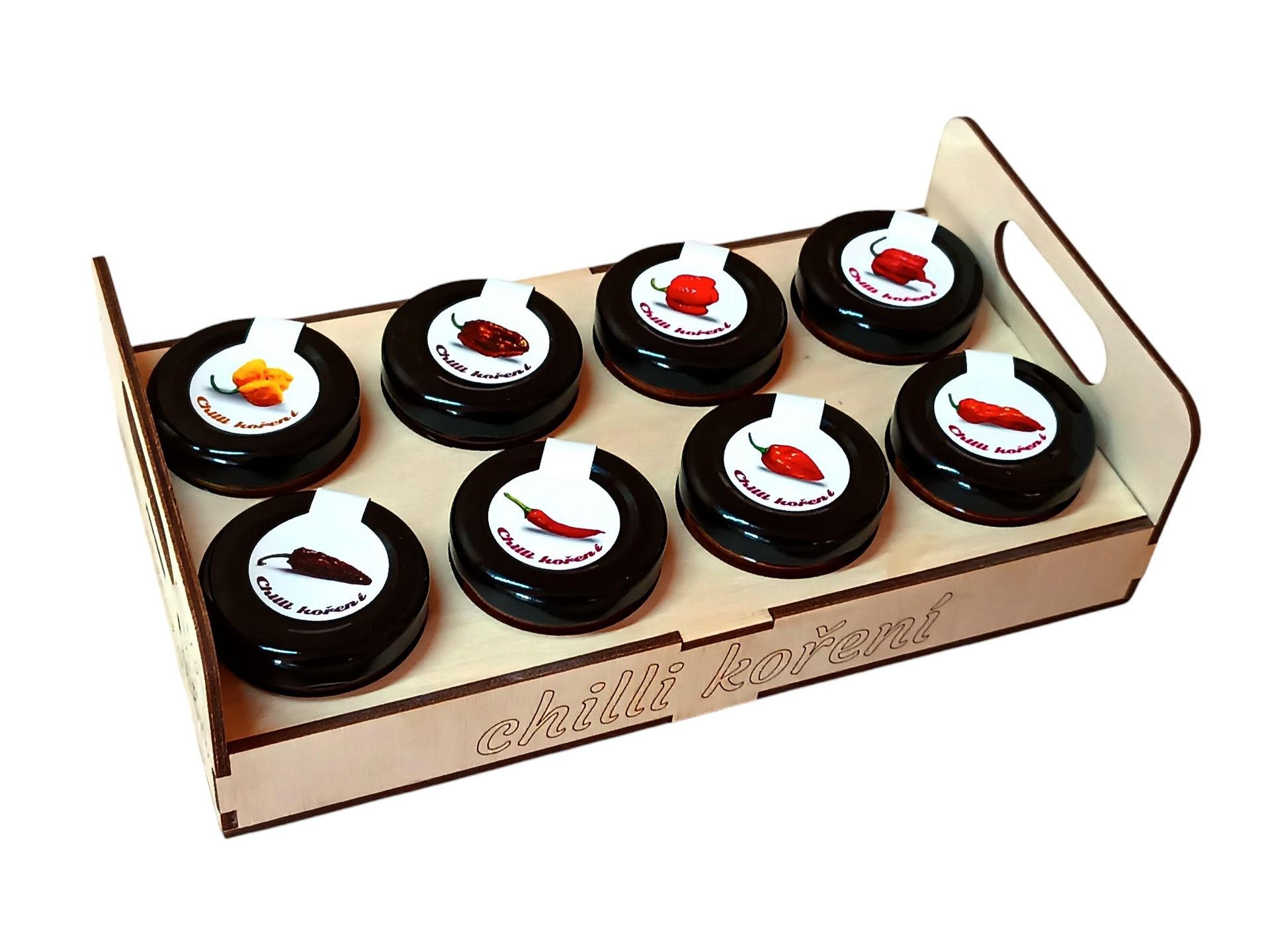 Dřevěný stojánek s 8 druhy od málo pálivého až po extrémně pálivého chilli koření z naší nabídky