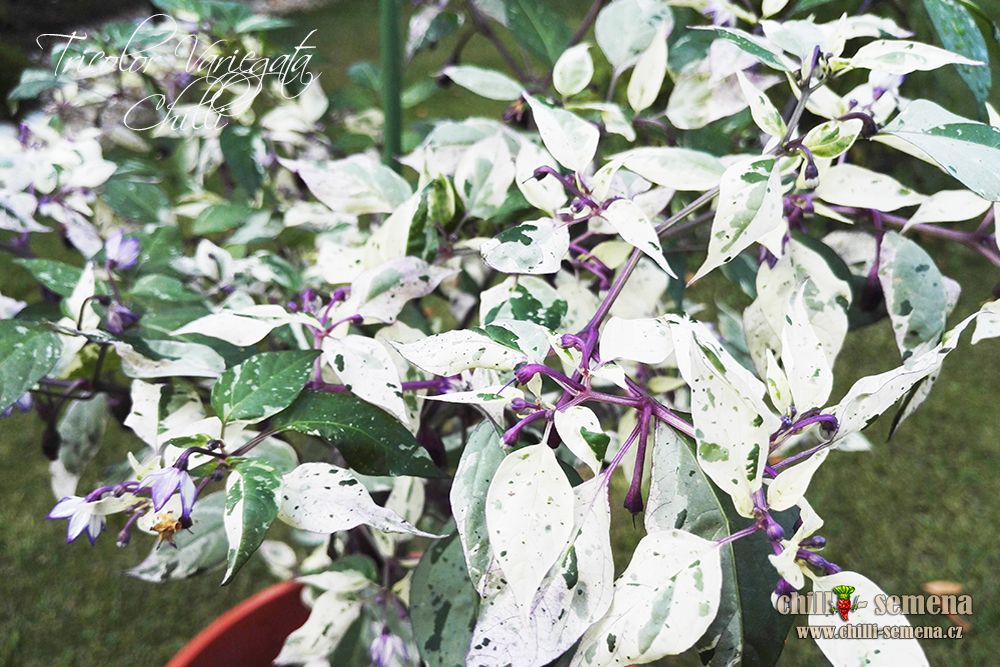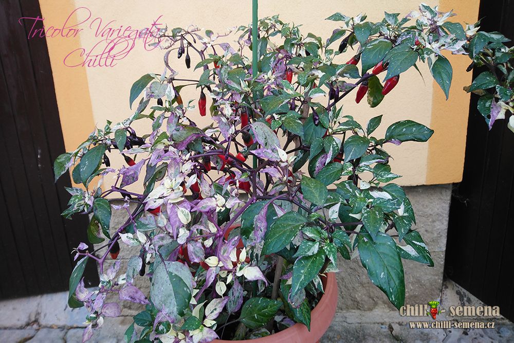 Tricolor Variegata Chilli je velmi atraktivní (kráska mezi rostlinami) rostlina s fialovo-bílo-zelenými listy. Velké množství plodů vhodných do salátů, na zavařování i sušení. Velmi vhodná za okno - balkon, jako okrasná rostlina!